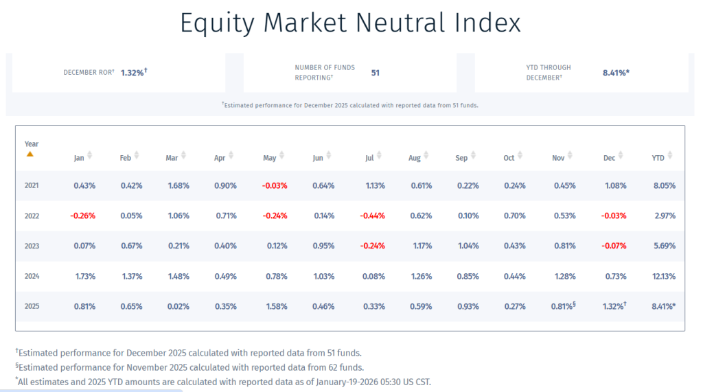 The Barclay Hedge Equity Market Neutral (EMN) Index aggregates results from roughly 60 professional market-neutral hedge funds. These funds typically run long/short equity portfolios with tight factor controls, low net exposure, and disciplined risk management.