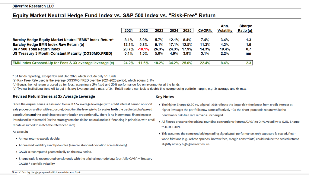 From 2021–2025, the raw EMN index (before fees are netted out but without aggressive leverage) produced: